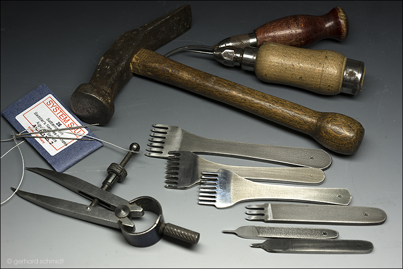 Der Hammer und die Stecheisen stammen noch von meinem Urgroßvater, eventuell sogar von meinem Ur-Urgroßvater - beide waren Schuhmacher. Die diversen Locheisen aus gehärtetem rostfreiem Stahl habe ich selbst angefertigt.