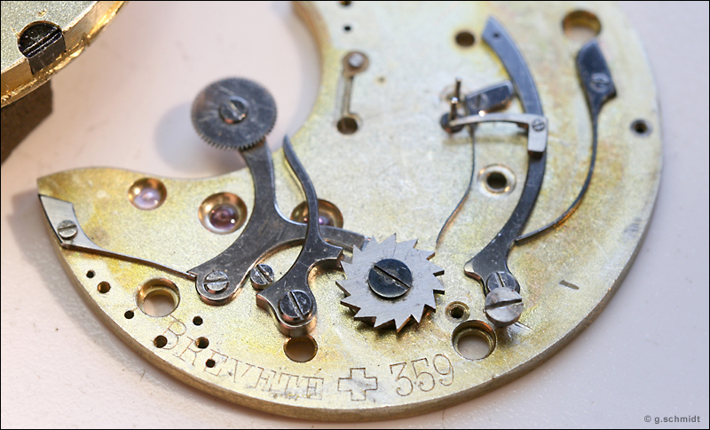 Zwei Lagersteine und die hauchdünne Feder, die den aufgesteckten Schalthebel vom springenden Minutenzähler zu Seite und gleichzeitig nach unten drückt, musste ich ersetzen.